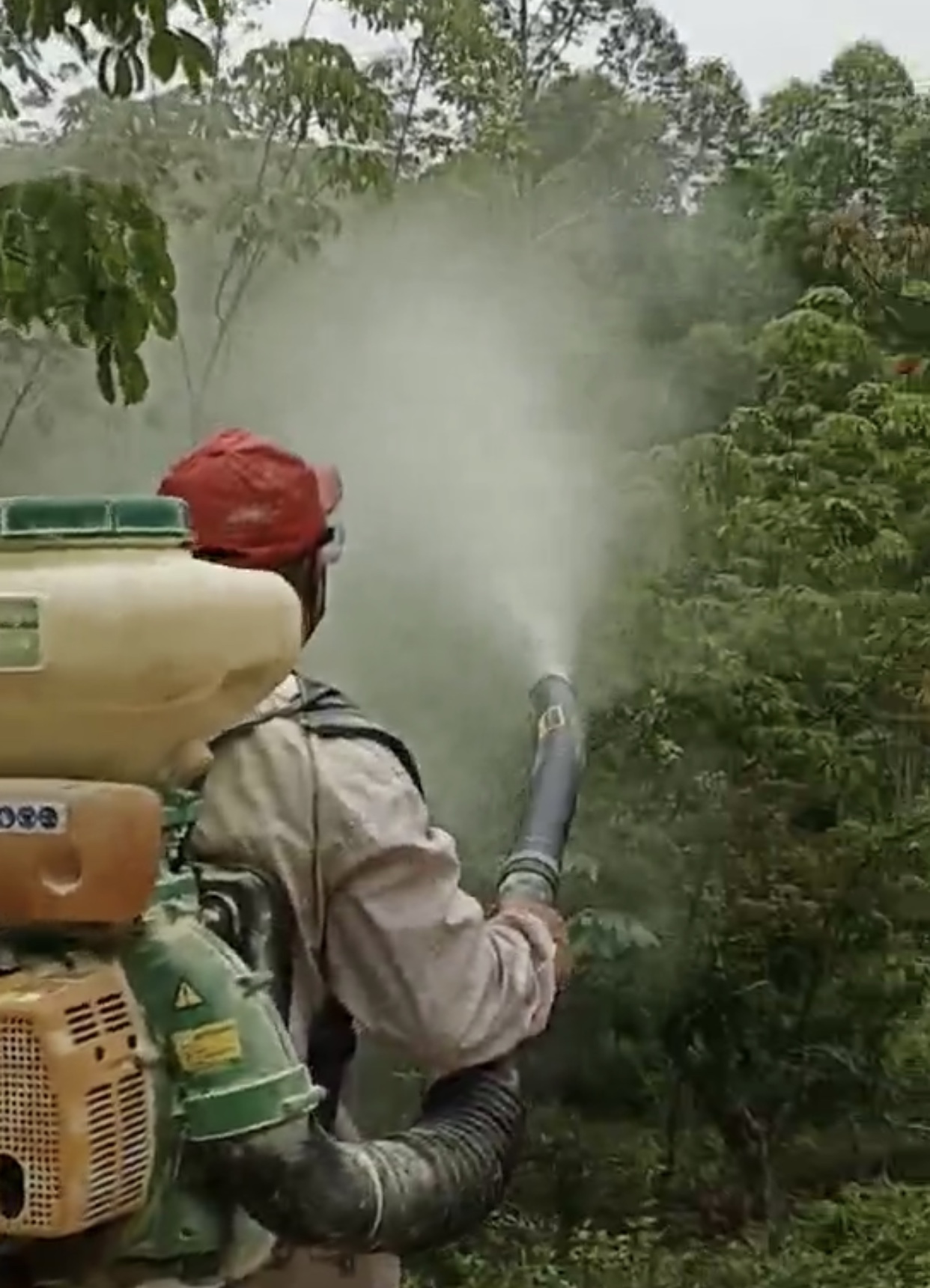 大坪農(nóng)場十分重視橡膠基地“兩病”的防冶工作,把防冶“兩病”工作列入當(dāng)前的重要議事日程。在已深入調(diào)查了解的基礎(chǔ)上,根據(jù)各林段、品系以及蟲害的程度,制定防冶工作方案,有計劃,有步驟地分期實施。階段來,共出動144人次,分成4個小組,全面對橡膠基地進行噴藥,技術(shù)人員及時跟進,組織檢查“回頭看”,盡量把“兩病”造成的損失降到最低限度。